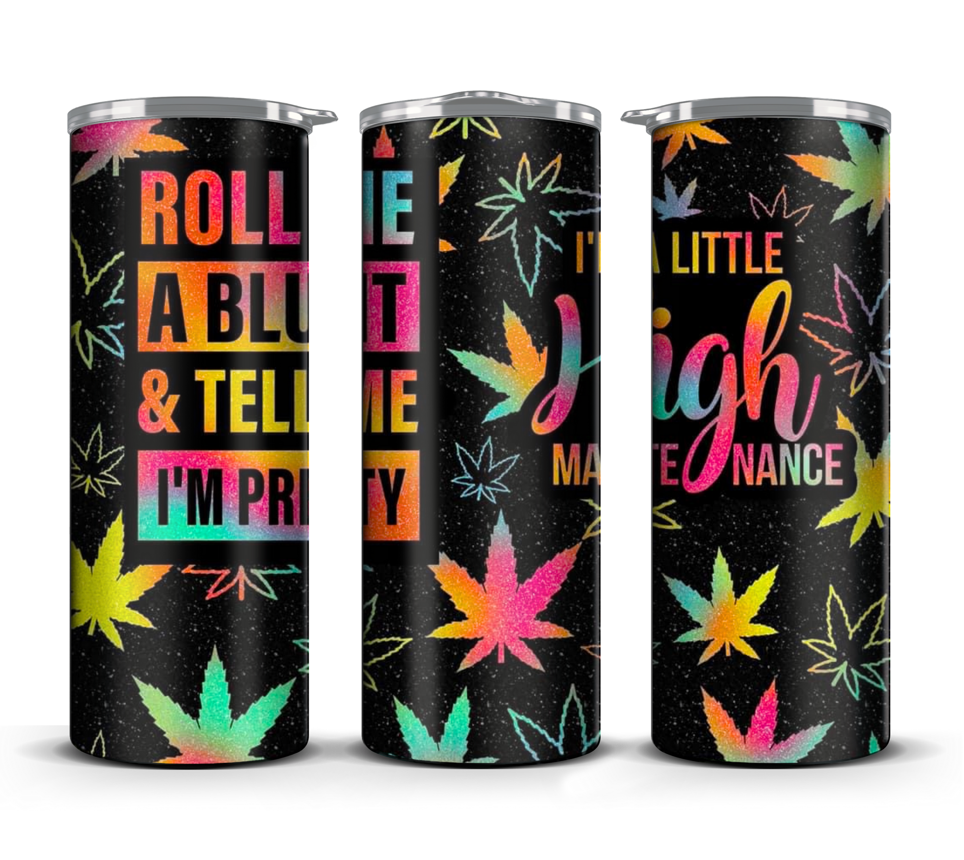 Let your personality shine with this 20 oz tumbler! Featuring a witty phrase, it's the perfect accessory for every occasion. Enjoy your favorite drinks hot or cold on the go - roll me a blunt and tell me I'm pretty!