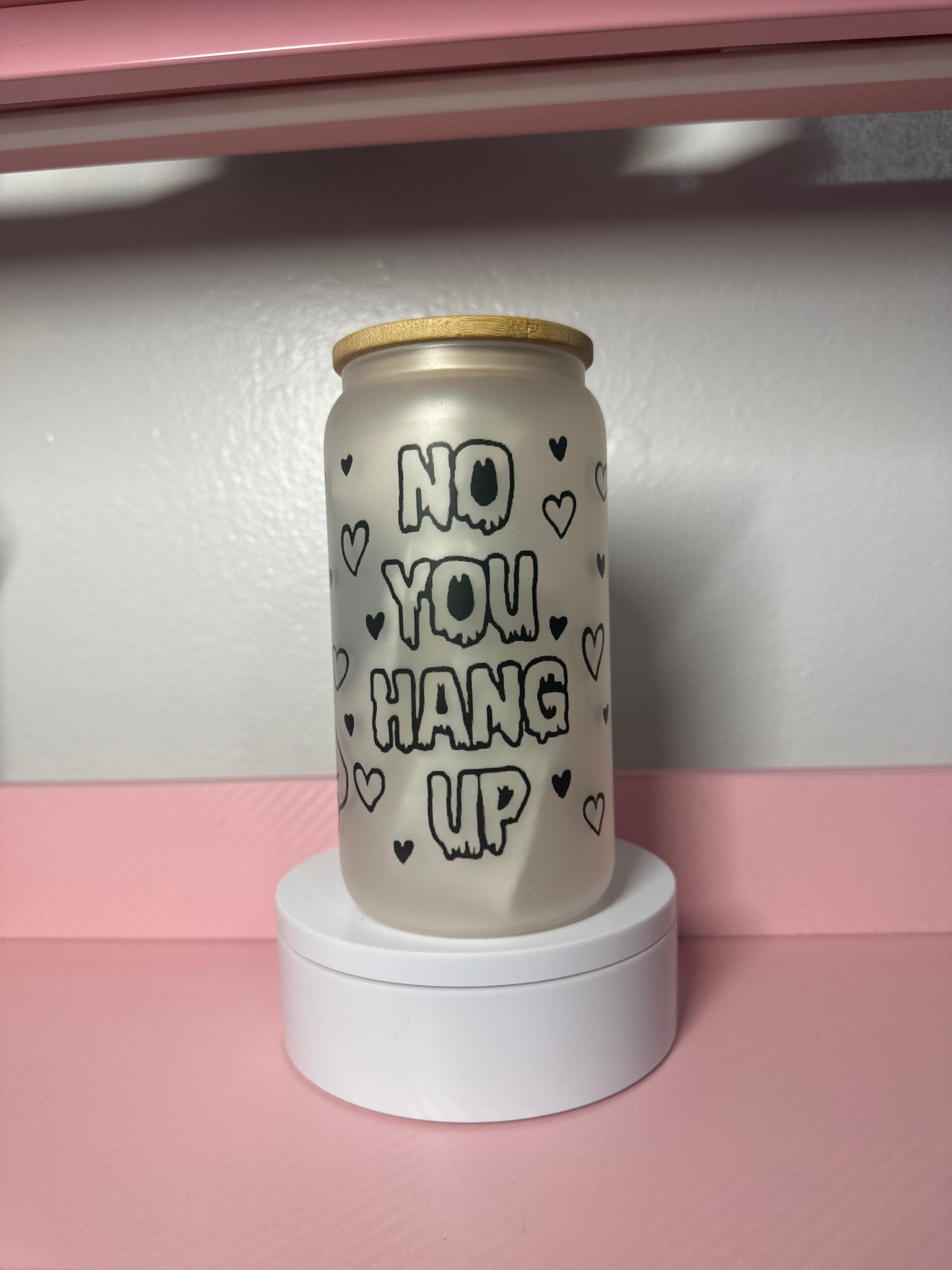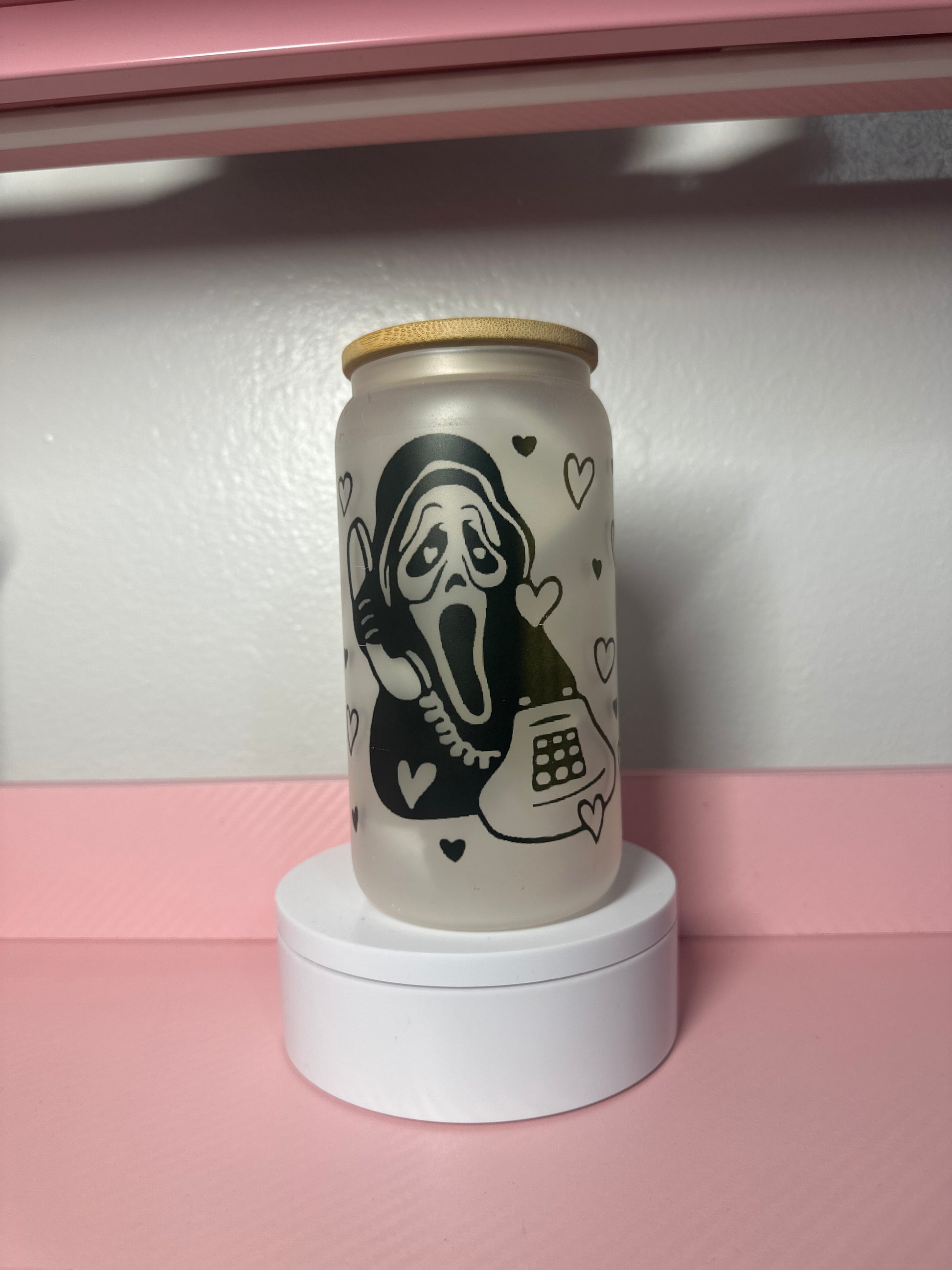 Libby glass tumbler featuring a Ghost Face design with "No You Hang Up" text. This 16oz tumbler combines horror-inspired artwork with everyday functionality. The sleek glass construction keeps drinks cold while the bold graphic makes a statement. Perfect for fans of iconic horror characters and edgy pop culture designs. Includes a matching lid and straw for convenient sipping on the go or at home.