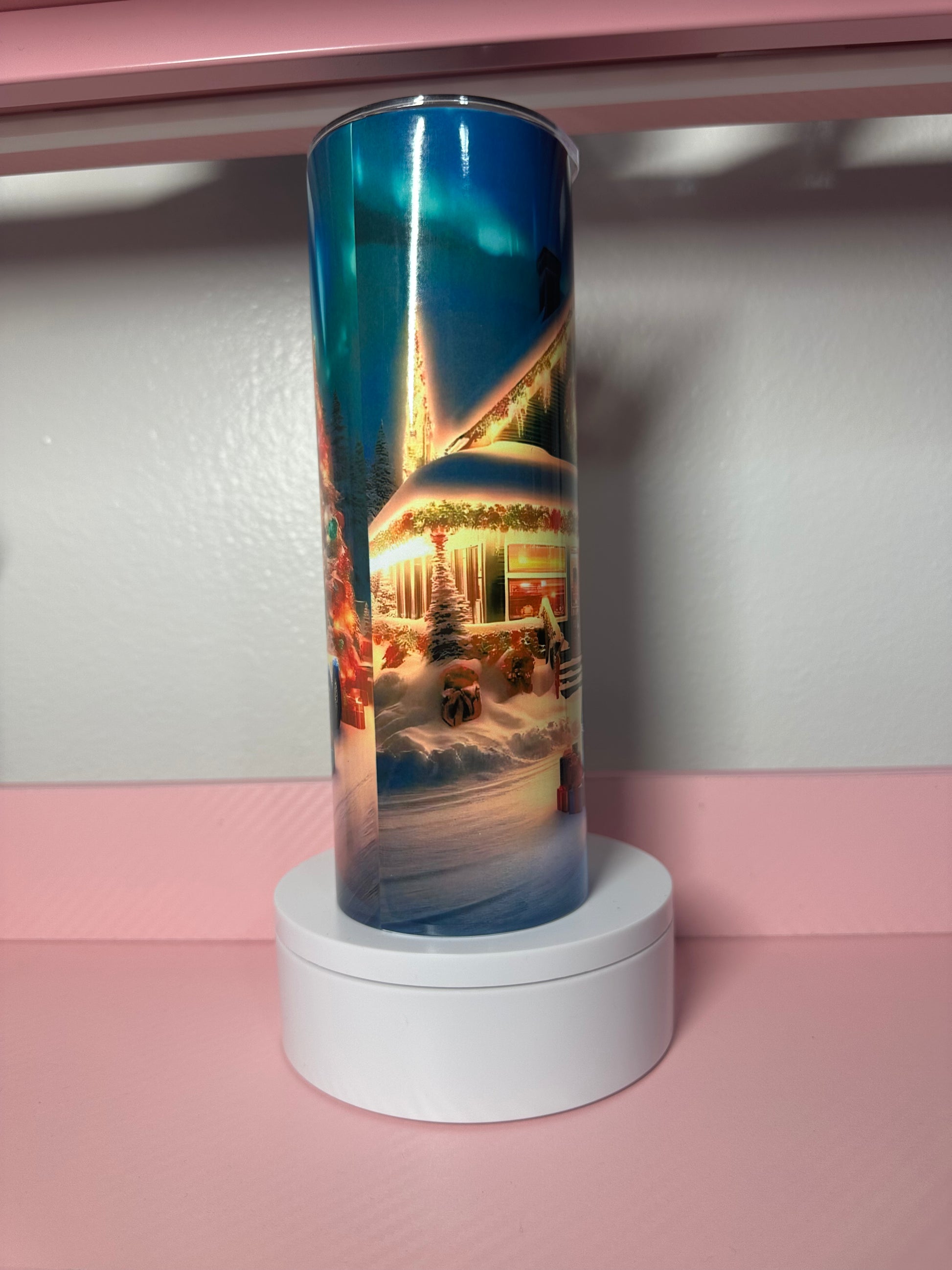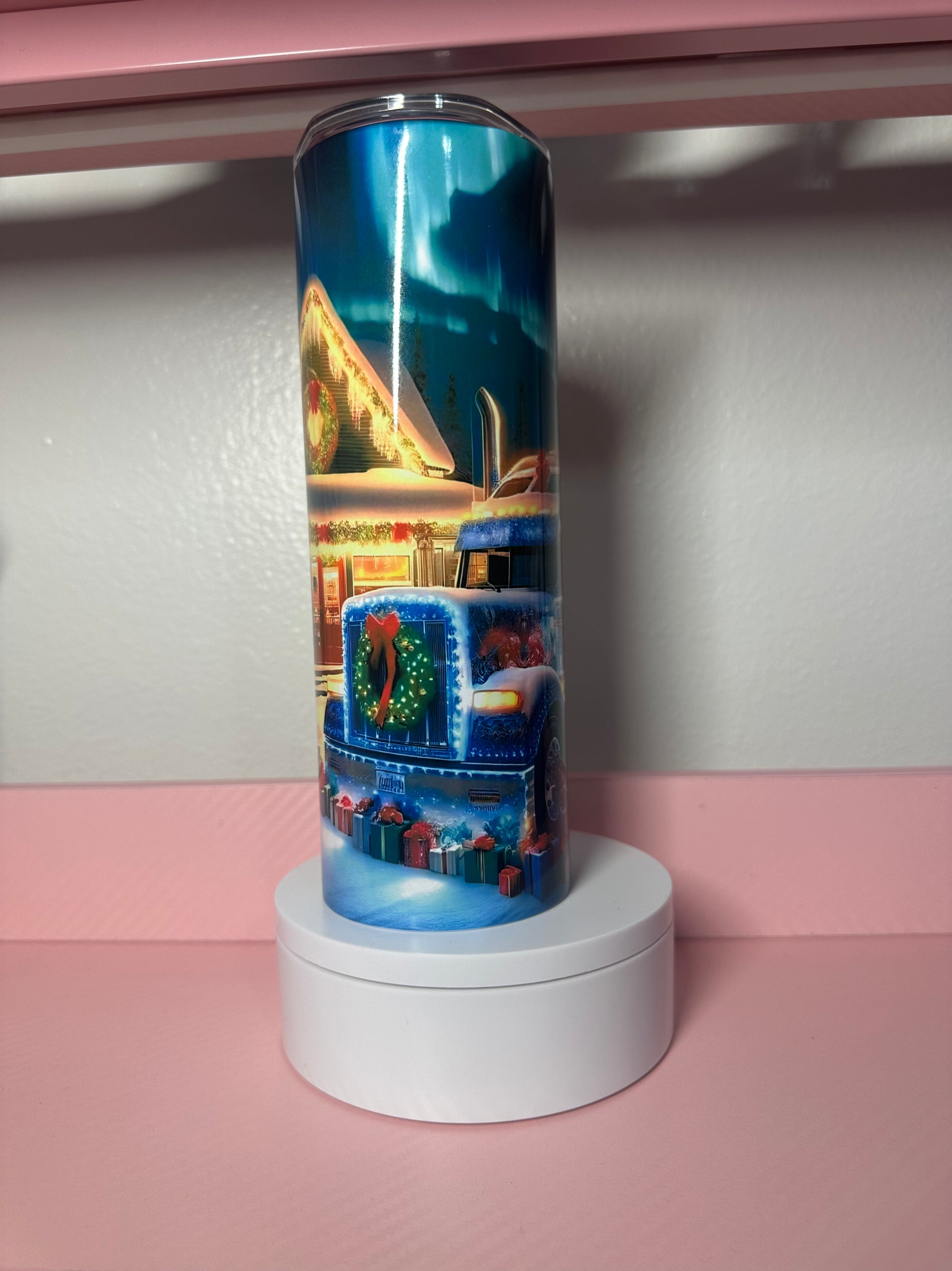 Celebrate the season with this festive 20oz tumbler featuring a charming holiday semi truck design complete with twinkling lights. Perfect for keeping your favorite beverages hot or cold while spreading holiday cheer. The durable construction and eye-catching graphics make it an ideal gift for truck enthusiasts and seasonal decorating lovers alike. Whether you're sipping cocoa by the fireplace or enjoying coffee on the go, this tumbler brings festive spirit to every sip.